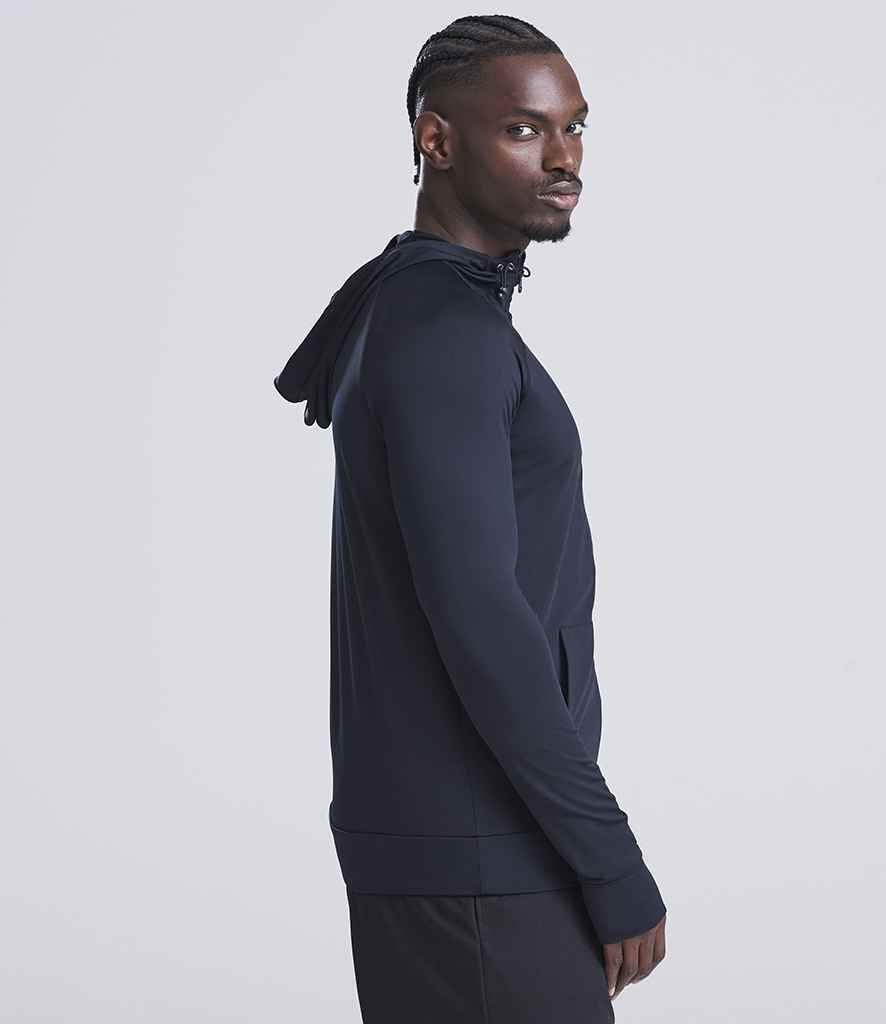 • Contrast melange effect grown on adjustable hood and raglan sleeves.
