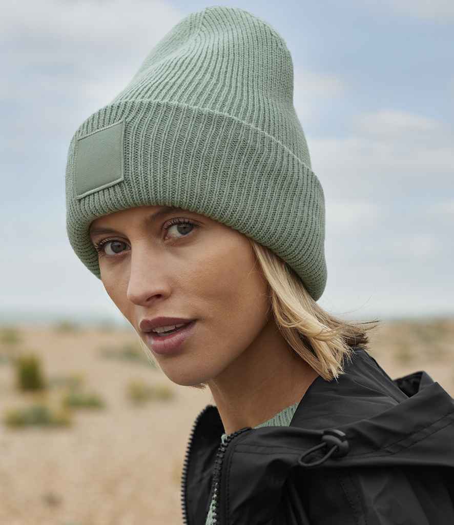Beechfield Deep Cuff Tonal Patch Beanie | Dusty Green.