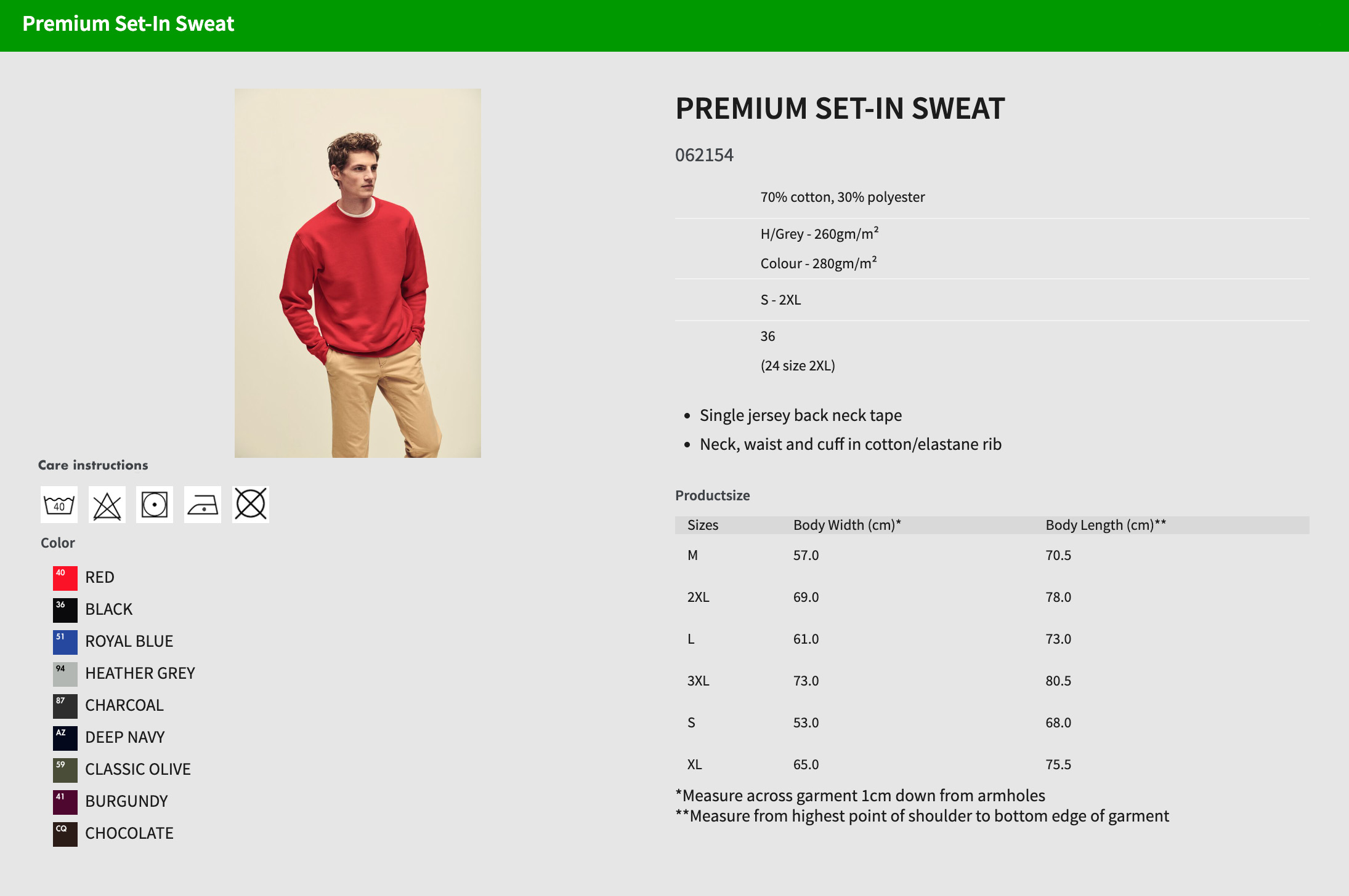 Weight: Heather Grey 260 gsm, Cols 280 gsm