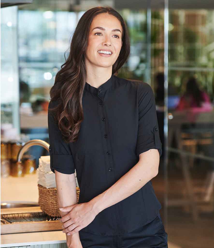 Henbury Ladies Mandarin Roll Sleeve Anti-Bac Wicking Shirt | Black.