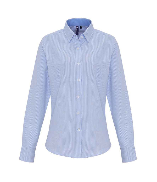 Premier Ladies Long Sleeve Striped Oxford Shirt | White/Oxford Blue.
